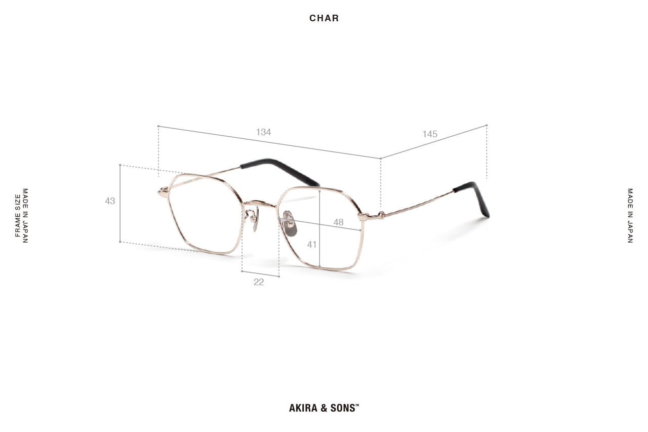 六角形ヘキサゴンメタルフレームのCHARにばブリッジバーを加えたLOTTE。角ばったデザインながら、天地幅を広めに取ることでリラックスしたスタイルを演出します。構造面では、フィッティングにこだわり、オリジナルのヒンジとテンプルを採用。ヒンジには純チタンを使用し、ひょうたん型に仕上げることで、顔幅や傾斜角の微調整が可能です。テンプルはベータチタン製で、柔らかな弾力性を持ちながら耳元でしっかりとホールドできる設計です。また、滑り止め効果のあるスリットが入ったモダンも備えています。